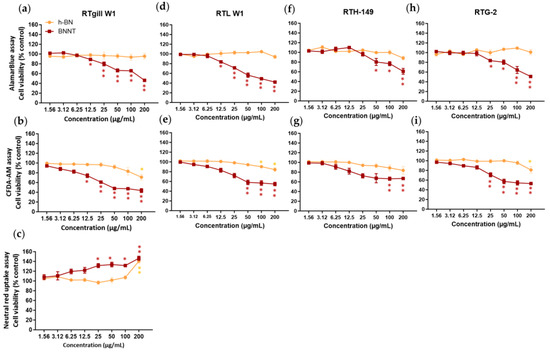 The CFDA-AM assay measures the plasma membrane integrity of cells, based on the entry of this cell-permeable probe into cells and its conversion by esterase activity to a highly fluorescent product, 5-CF, that is retained in cells with intact plasma membranes. In cells exposed to h-BN materials, decreases in the cell viability of a maximum of approximately 20% that lead to significant (p < 0.05) differences with respect to controls in the 5-CF signal were measured at the highest concentration (LOEC, 200 µg/mL) for RTgill-W1 and from 100 µg/mL (LOEC) in RTL-W1 cells. However, the BNNT-exposed cells showed a clear concentration-dependent effect with significant (p < 0.05) viability decreases starting at concentrations of 12.5 µg/mL (LOEC, RTgill-W1 cells), 50 µg/mL (RTL-W1), 100 µg/mL (RTH-149) and 25 µg/mL (RTG-2) (Figure 4). Taking into consideration any potential interferences and the data presented above (Section 3.3), the BNNT materials did not appear to be able to cause any quenching in the 5-CF assay product signal; however, they showed a strong binding affinity for CFDA-AM, which could lead to a lack of availability of CFDA-AM to cells causing false-positive results. The BNNT material also showed autofluorescence; therefore, any material attached to the surface of the well may contribute to the signal and thus increase the fluorescence values. This may explain the flattening of the line seen at the high exposure concentrations instead of a further reduction in viability.