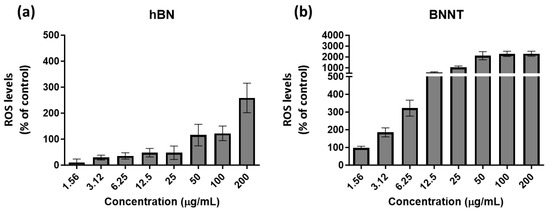The % of control levels measured for h-BN material-exposed cells started below the basal cellular control ROS levels (100%). However, following exposures to concentrations of 200 µg/mL, the h-BN levels increased to levels above the control and over 2-fold higher (Figure 5a). In contrast, the cells exposed to low concentrations of BNNTs had the same basal ROS levels as the control (100%), but this increased already following 3.12 µg/mL exposure and this effect was heightened with increased exposure concentrations reaching 10- to 20-fold higher levels than the control levels (Figure 5b).