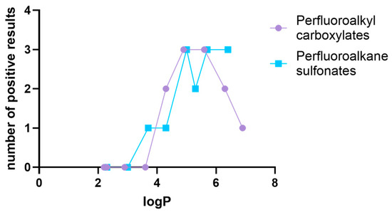 Comparison of the logP values (Table S1) of the compounds, with a number of positive results for AR, ERα, and ERβ interactions, shows that higher lipophilicity was associated with more interactions (Figure 1). This trend was more pronounced in the case of perfluoroalkane sulfonates. 9-Cl, with a logP of 5.3, seemed to follow this trend poorly, with only two predicted interactions. However, this was the only chlorinated compound among the sulfonates tested (see Table S1); therefore, different interactions with the receptors can be expected.