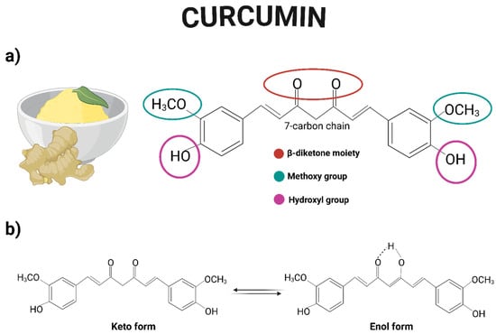 (a) Chemical structure of curcumin, highlighting the hydroxyl and methoxy functional groups, as well as the β-diketone moiety. (b) Representation of the keto-enol tautomerism of curcumin. Created with BioRender.com.