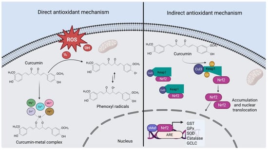 Under normal homeostatic conditions, the Kelch-like ECH-associated protein 1 (Keap1) anchors Nrf2 in the cytosol and facilitates its degradation. Keap1 acts as an adaptor for the Cullin 3 (Cul3)-based E3 ubiquitin ligase complex, promoting Nrf2 ubiquitination and subsequent proteasomal degradation, thereby preventing its activation. However, curcumin induces the modification of cysteine residue 151 in Keap1, leading to conformational changes that hinder Keap1’s ability to mediate Nrf2 ubiquitination by the Cul3 complex. As a result, Nrf2 accumulates, stabilizes, and translocates into the nucleus, where it dimerizes with small proteins (such as Maf or Jun). This dimerization allows Nrf2 to bind to antioxidant response elements (AREs), activating the transcription of a variety of genes encoding cytoprotective, antioxidant, and phase II detoxification proteins [39,40,41,42]. Figure 2 summarizes the antioxidant mechanisms of action of curcumin, including both direct and indirect pathways.