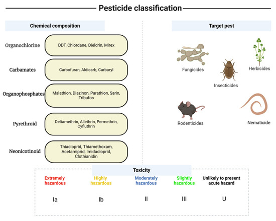 Pesticide classification by chemical structure, targeted pest species, and toxicity (created with BioRender.com).