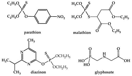 The vast quantity of OPPs that persist in food, drinking water, soil, and air can enter the human body by oral, skin, inhalation, or ocular contact, posing health risks. Chemical structures of widely used organophosphate insecticides are presented in Figure 3 [41].
