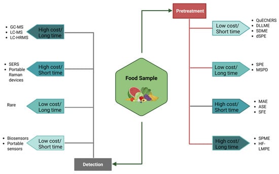 The common approach for detecting and quantifying pesticide levels in samples is based on chromatographic methods (GC, LC, HPLC, UHPLC, SFC) with different detectors, although the sample preparation procedure is often matrix-specific [68]. Various sample preparation approaches have been proposed to extract pesticide residues from food products; nevertheless, we highlight the most effective and thoroughly investigated methods. Contemporary trends in analytical chemistry emphasize the simplification and miniaturization of the analytical process. The traditional liquid–liquid extraction method is hindered by time consumption, reliance on harmful volatile organic chemicals, and the generation of substantial waste solvent volumes. Consequently, to mitigate these constraints, researchers have devised many microextraction techniques [69].
