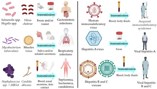 Examples of pathogenic bacteria (Salmonella spp., Shigella spp., Vibrio cholerae, Mycobacterium tuberculosis, Staphylococcus spp. including methicillin-resistant Staphylococcus aureus), viruses (measles virus, human immunodeficiency virus, hepatitis A, B, and C viruses), and fungi (Candida albicans) potentially linked to healthcare waste. The figure illustrates their main transmission routes (i.e., feces, vomit, saliva, inhaled secretions, blood, body fluids, nasal secretions, skin contact) and the associated infections (gastroenteric, respiratory, septicemia, bacteremia, candidemia, acquired immunodeficiency syndrome, and viral hepatitis). MRSA, Methicillin-resistant Staphylococcus aureus.