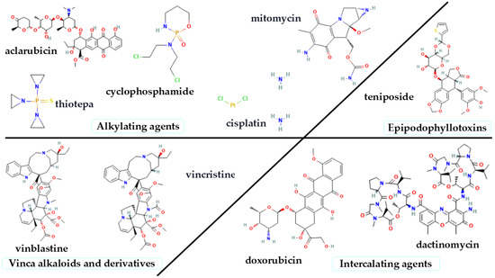 Figure 4 illustrates the classification and chemical structures of cytotoxic drugs hazardous to the eyes and skin, including alkylating agents, intercalating agents, vinca alkaloids and derivatives, and epipodophyllotoxins, highlighting both vesicant and irritant drugs within each category [24,50].