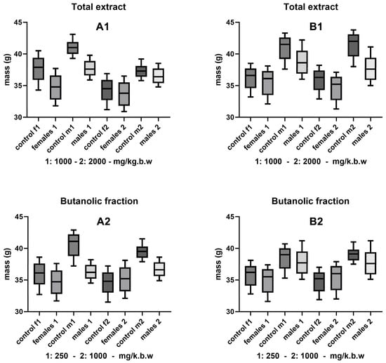 Figure 1. Acute single-dose toxicity. Effect of hydroethanolic extract (1000 and 2000 mg/kg bw) and butanolic fraction (250 and 1000 mg/kg bw) on body mass of mice by sex and treatment for 14 days. Oral (A1,A2) and intraperitoneal (B1,B2) routes of administration.