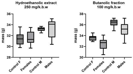 Figure 2. Repeated dose toxicity. Effect of hydroethanolic extract (250 mg/kg bw) and butanolic fraction (100 mg/kg bw) on body mass of mice by sex and treatment for 14 days. Oral route of administration.