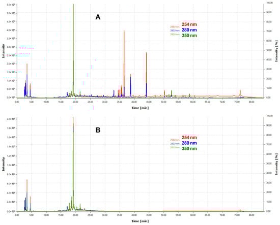 In the total hydroethanolic extract (A), the chromatogram reveals a greater chemical complexity, with multiple peaks distributed throughout the retention time (0–80 min). At 254 nm, a high density of peaks is observed in the initial range (0–20 min) and in the middle range (30–50 min), indicating the presence of aromatic compounds and conjugated bonds. At 280 nm, peaks between 35 and 40 min stand out, possibly associated with phenolic compounds or flavonoids. At 350 nm, fewer peaks and lower intensity are detected, suggesting that absorbing compounds at this wavelength, such as flavonoids with extensive conjugated systems, are less abundant. Some dominant peaks exhibit absorption at all wavelengths, indicating the presence of polyfunctional compounds with multiple chromophore groups [65,66,67].