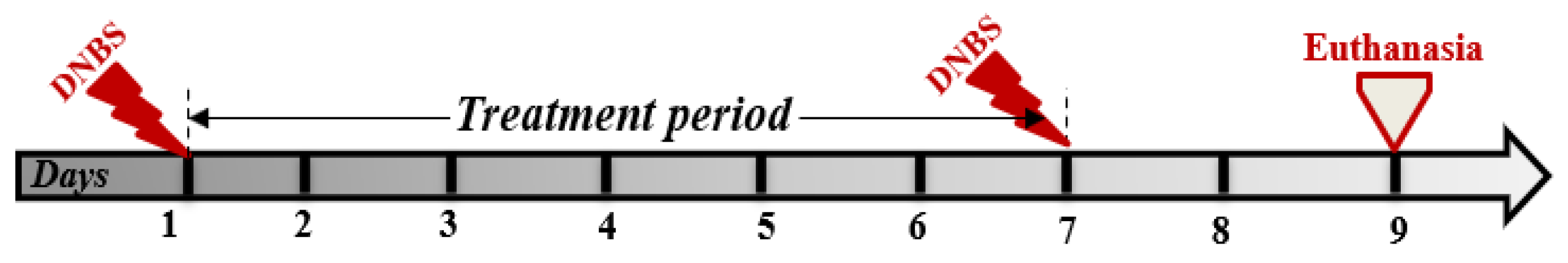 - Morampudi, V.; Bhinder, G.; Wu, X.; Dai, C.; Sham, H.P.; Vallance, B.A.; Jacobson, K. DNBS/TNBS Colitis Models: Providing Insights into Inflammatory Bowel Disease and Effects of Dietary Fat. J. Vis. Exp. JoVE 2014, 84, 51297. [Google Scholar] [CrossRef]