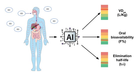 The most relevant models were then used to assess the TK properties of potential endocrine-disrupting chemicals (EDCs). The focus on this category of chemicals is motivated by the fact that EDCs can disrupt the endocrine system and cause cancer, metabolic disorders, neurocognitive functions, infertility, immune diseases, and allergies [23,24,25,26,27] by interfering with the estrogen, androgen, and thyroid hormone receptors, exerting steroidogenesis (ER, AR, and TR)-mediated effects [28]. Thus, predicting potential EDCs with high oral bioavailability and high VDss could be relevant for regulatory purposes.