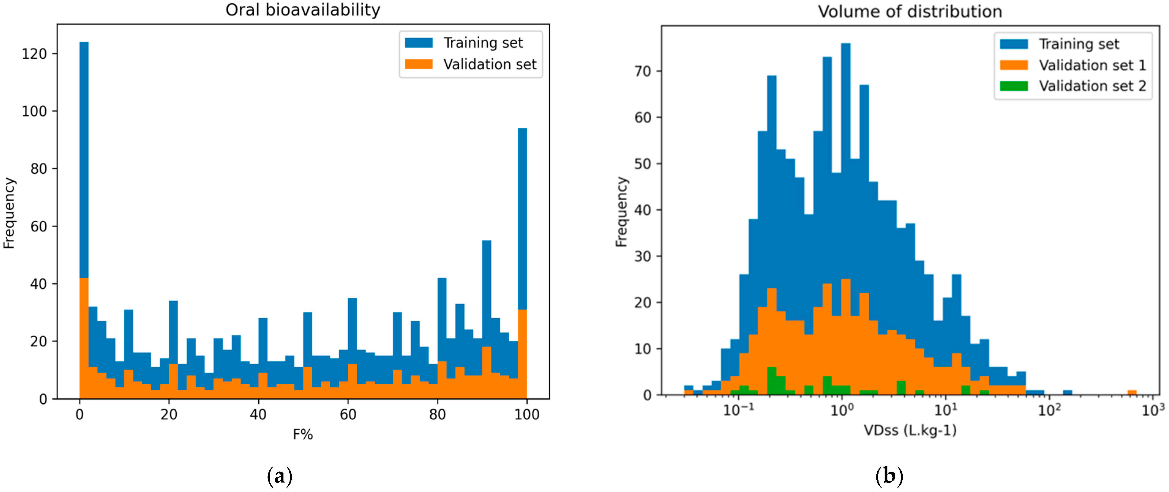 Figure 1. (a) Histograms of the distribution of oral bioavailability for the training set and the validation set for all chemicals with continuous F% values. (b) Distribution of the values characterizing VDss for the training set and validation sets 1 and 2.