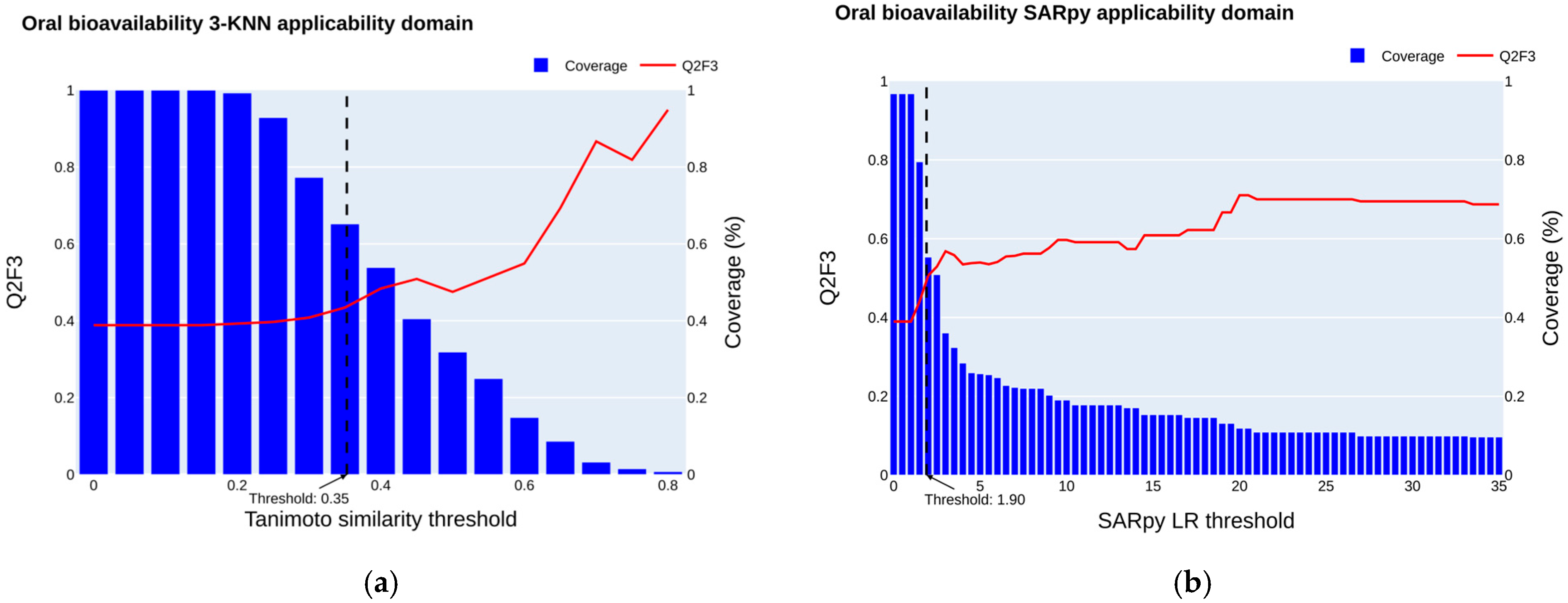Figure 2. The effect of different definitions of applicability domains on coverage and predictive performance. (a) The 3-NN Tanimoto AD. The evolution of Q2F3 performance between observed and predicted values (red) on the validation set, between predicted and real values according to different Tanimoto thresholds ranging from 0 to 1. The evolution of the validation set coverage is plotted as blue bars. The model tested is the CatBoost regression method predicting F% values. (b) The SARpy LR AD. The evolution of Q2F3 performance (red) on the validation set according to different Log ratio thresholds relative to the structural alert associated with query chemicals. The evolution of the validation set coverage is plotted as blue bars.