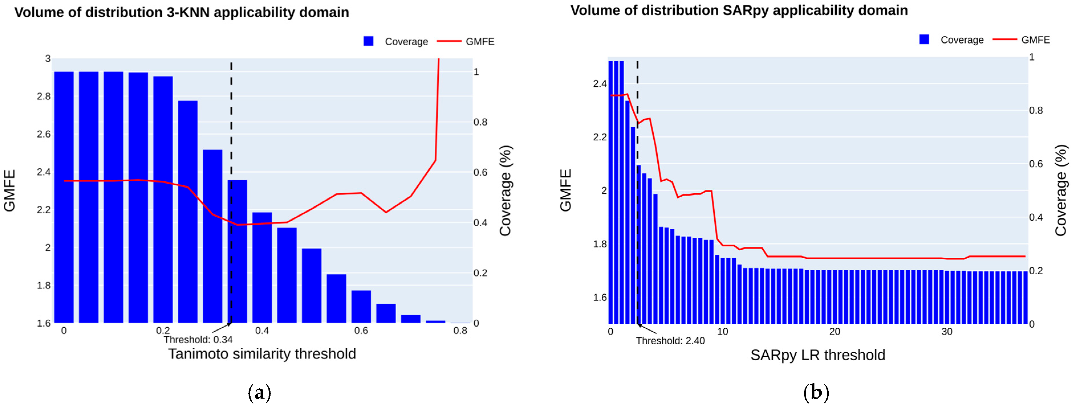 Figure 3. The effect of different definitions of applicability domains on coverage of validation set 1 and predictive performance (a) The 3-NN Tanimoto AD. The evolution of the GMFE (in red) on validation set 1 according to different Tanimoto thresholds ranging from 0 to 1. The evolution of the coverage of the validation set is plotted as blue bars. (b) The SARpy AD. The evolution of the GMFE performance (in red) on the validation set according to different Log ratio thresholds relative to the structural alert associated with the prediction. The evolution of the effective size retained in the validation set is plotted alongside in blue. The plot was made using the SARpy model with the 0.6–5 L·kg−1 threshold.