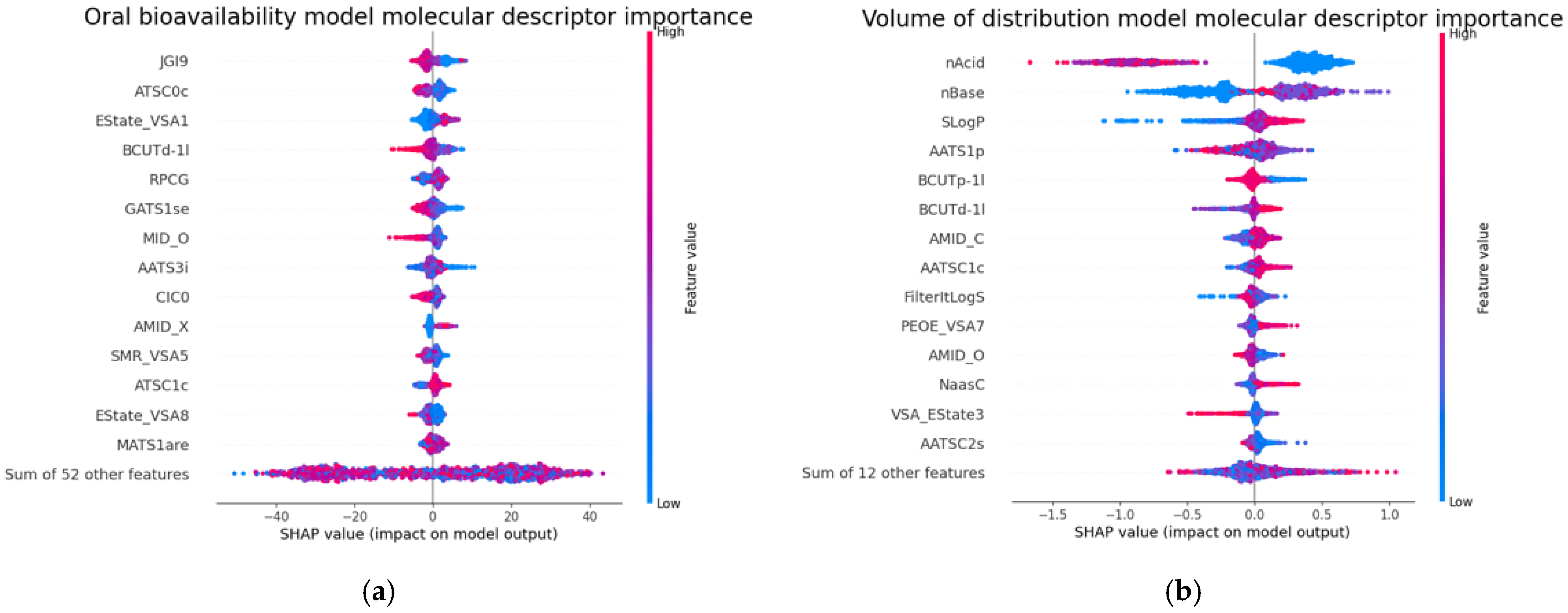 For VDss, Figure 4b depicts the molecular descriptor importance for the R-RF regression model. Among the top 15 molecular descriptors, we observe those that impact the model’s prediction. We observe that low numbers of acidic groups increase VDss and low numbers of base groups decrease VDss. Another important molecular descriptor is the logarithm of the n-octanol–water partition coefficient (SLogP), an important factor in pharmacokinetics. These molecular descriptors were previously found to impact VDss [23].