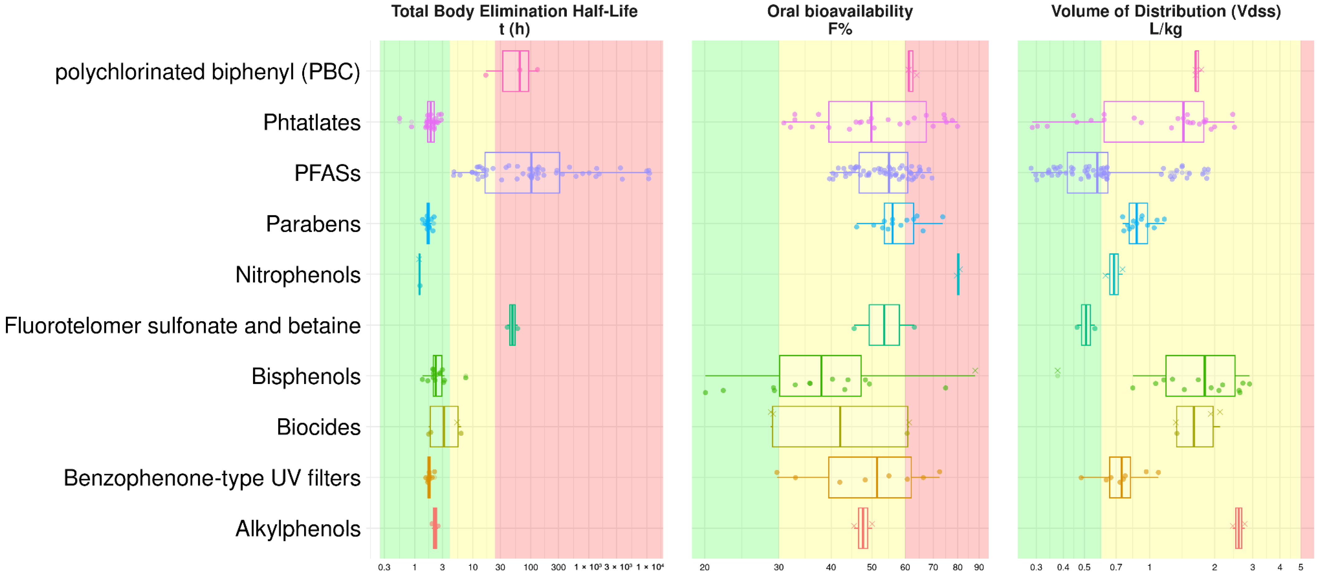 Figure 5. Boxplots of the predictions for oral bioavailability, VDss, and elimination half-life for a set of 131 EDCs categorized into 10 chemical categories. Perfluoroalkylcarboxylic acid (PFCA), perfluoroalkylsulfonic acid (PFSA), perfluoroalkylether acid (PFEA), perfluoroalkane sulfonamide derivative (PASF), perfluoroalkyl phosphonic acid (PFPiA), and polyfluoroalkyl phosphate diester (diPAP) categories were grouped as PFASs. Chemicals inside the SARpy AD are represented as circles, and chemicals outside as crosses. Background colors are set to green, orange, and red for, respectively, low, medium, and high values of VDss (thresholds: 0.6 L·kg−1 and 5 L·kg−1), oral bioavailability (thresholds: 30% and 60%), and elimination half-life (thresholds: 4 h and 24 h).