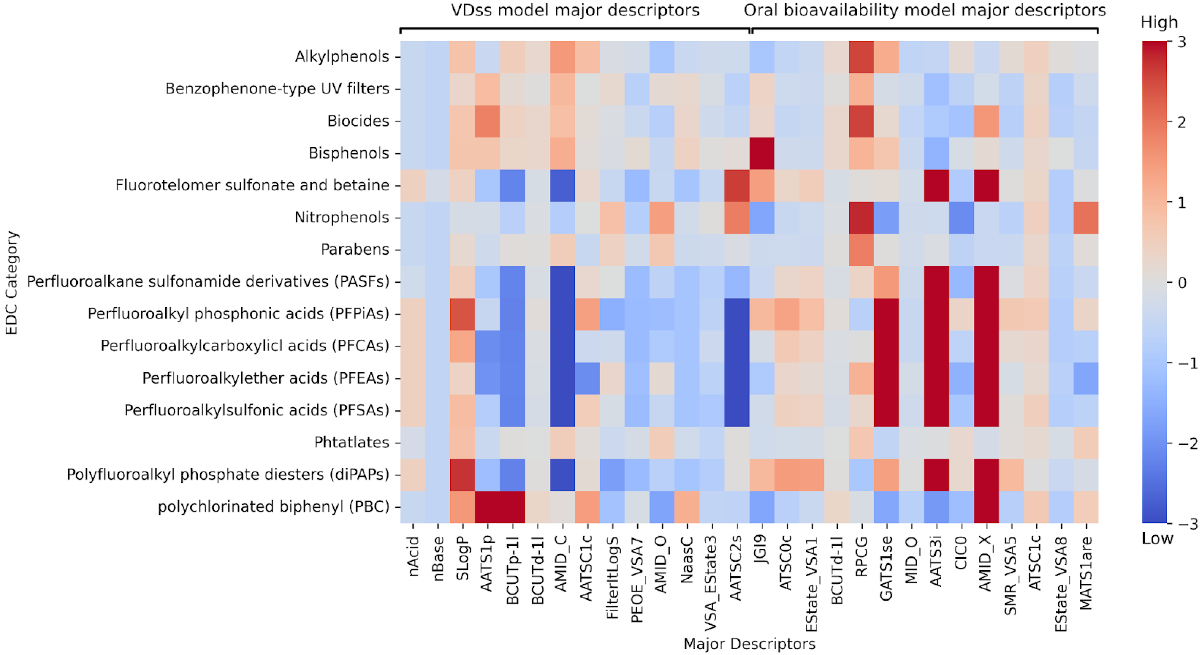 Figure 6. Heatmap of the mean standardized descriptor values for the EDC list, grouped by EDC families, based on the major descriptors of the oral bioavailability and VDss models. Standardization was performed using the mean and standard deviation computed from the training set.