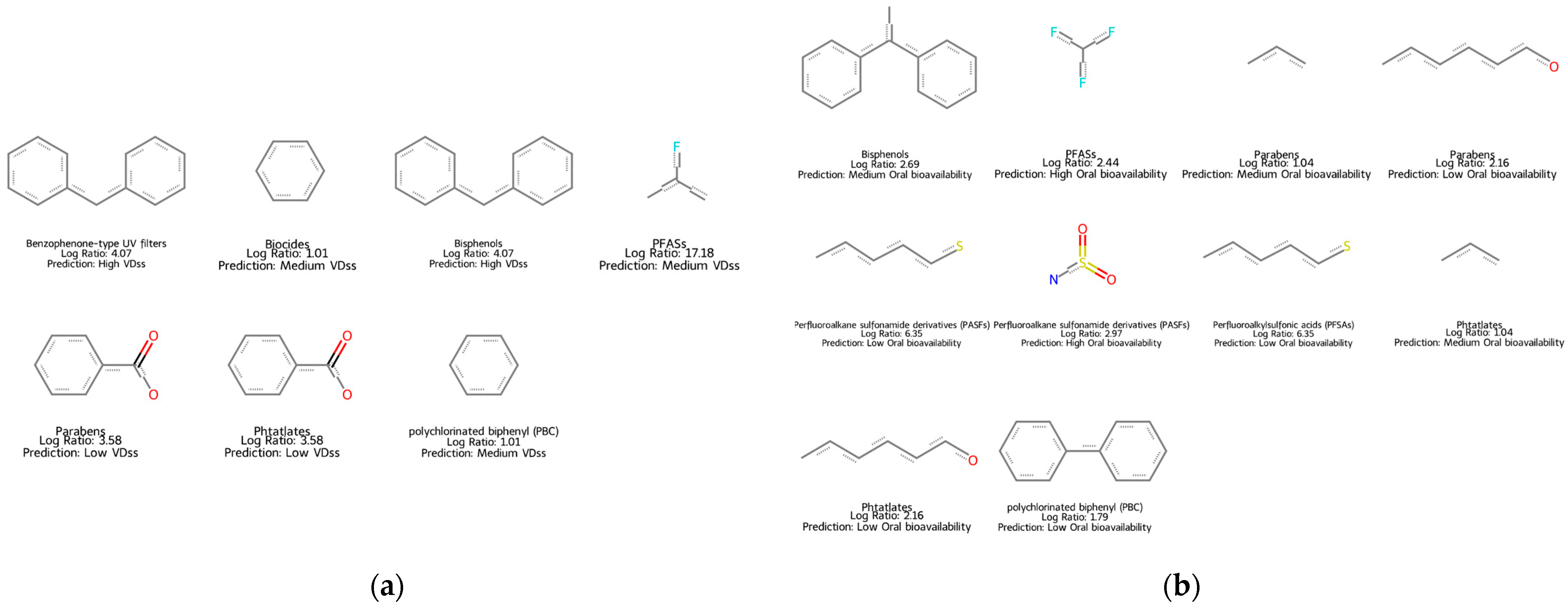 Figure 7. Structural fragment alerts identified by MC-SARpy in more than two chemicals across different EDC categories for the VDss (a) and oral bioavailability (b) models. The Log ratio and the predicted category associated with each structural alert are reported. PASFs, PFCAs, PFEAs, PFSAs, diPAPs, and PFPiAs were combined into the PFAS category when the structural fragment was identical.