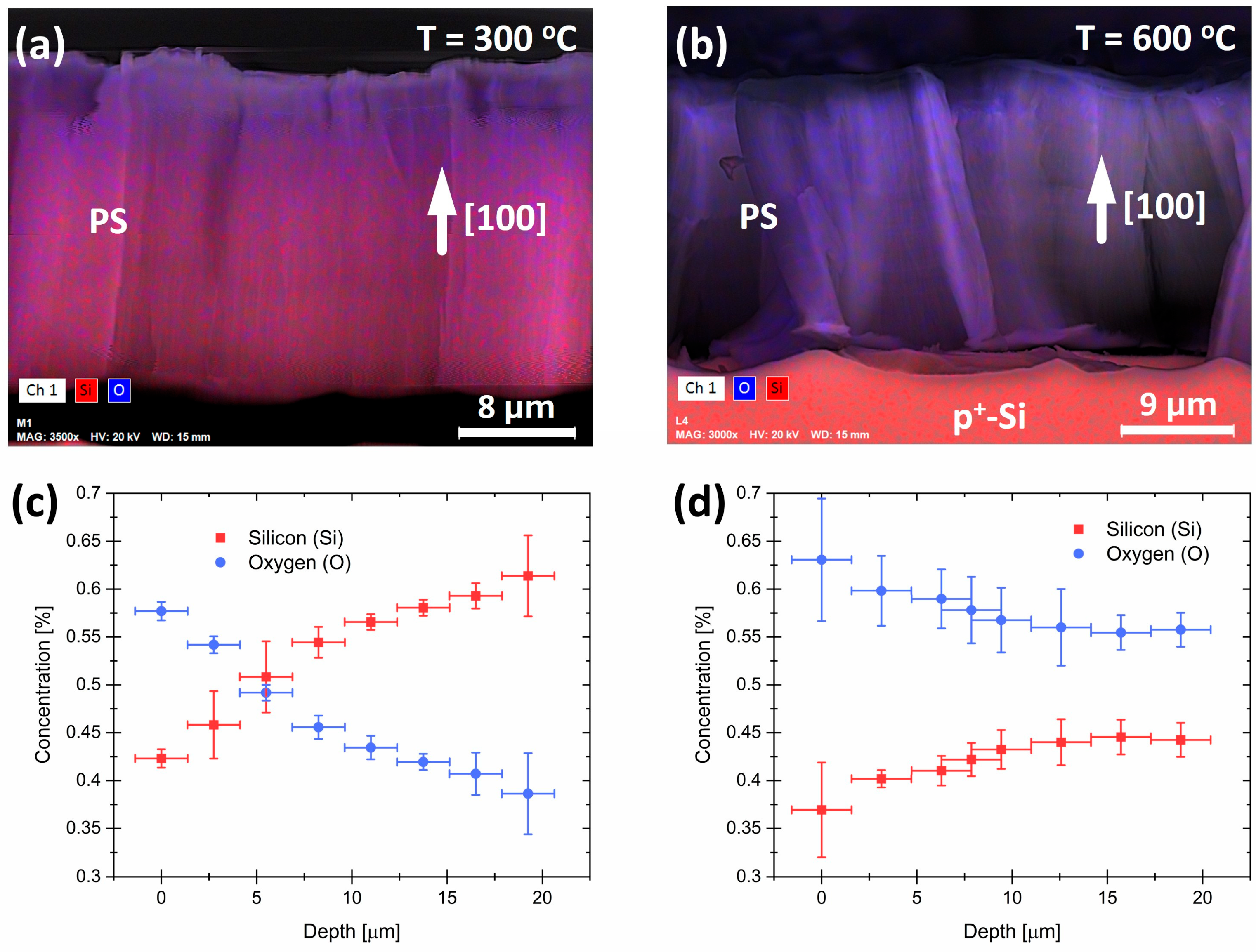 Figure 2a,b display cross-sectional SEM images of the PS layers annealed in air at 300 °C and 600 °C, respectively. The colors in the images represent the different atoms present in the layers. Blue represents oxygen (O) atoms, and red represents silicon (Si) atoms, as determined by EDX analysis. In contrast to the sample annealed at 600 °C, the sample annealed at 300 °C shows a higher concentration of O atoms at the surface, indicating that the PS layer was not evenly oxidized. As a comment to both pictures, the p+ substrate appears in Figure 2b and not in Figure 2a, since the latter was detached from the substrate.