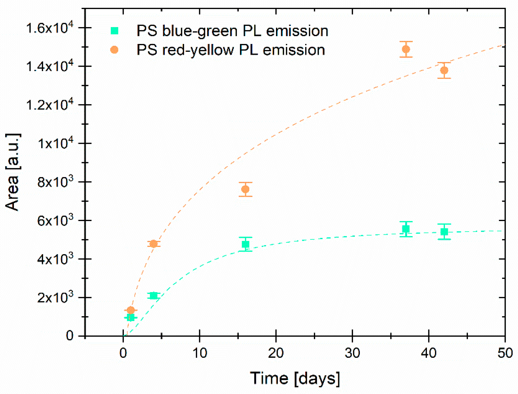 The PL emission of PSps was divided into two components: yellow–red emission attributed to Si QDs and blue–green emission representing the further oxidation of smaller Si QDs. These components evolved differently over time, with the yellow–red emission increasing at a higher rate until stabilization around 5 weeks after synthesis, while the blue–green emission stabilized a couple of weeks after the PSps synthesis.
