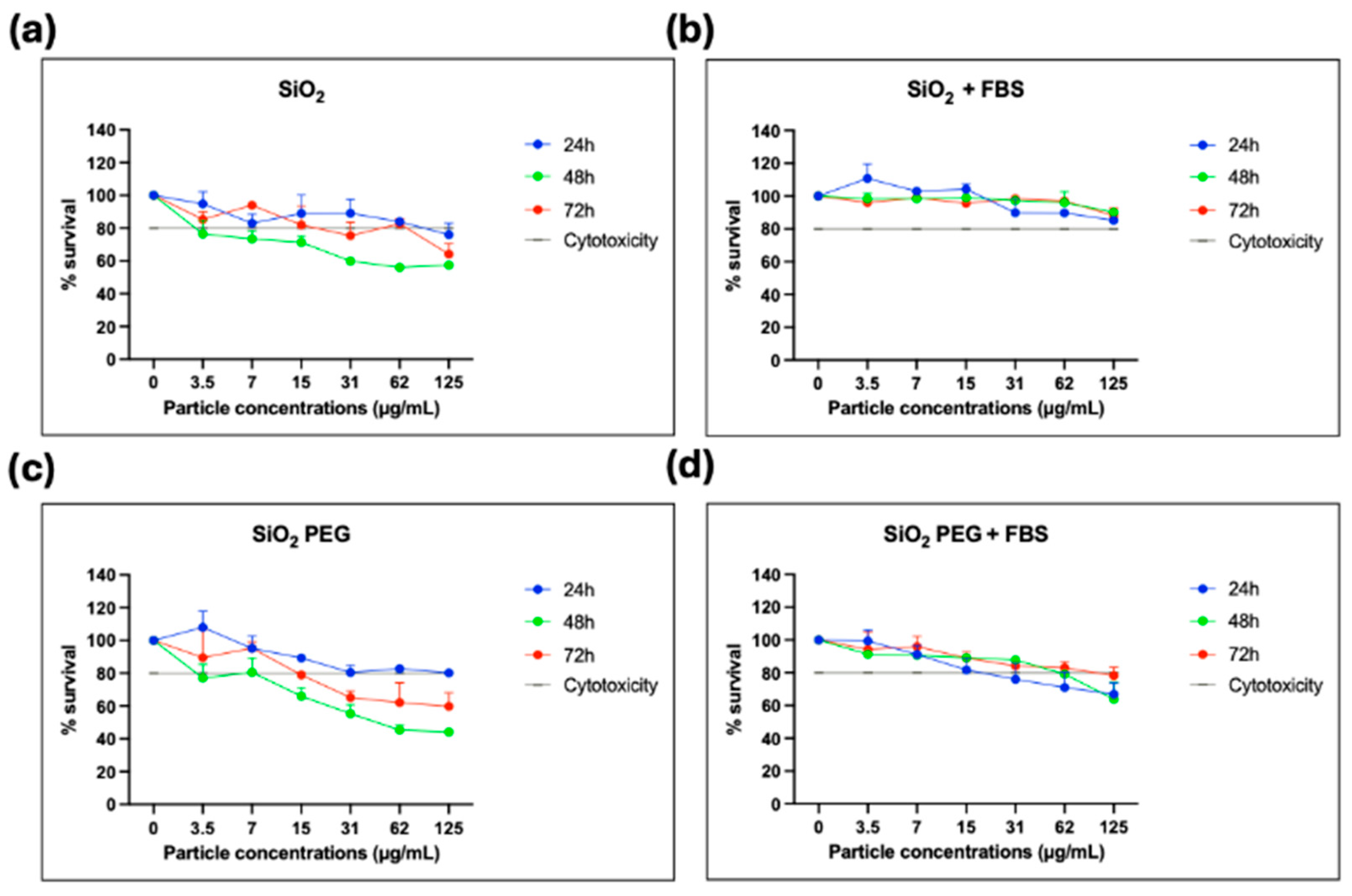 Figure 5. Cell viability assessed by MTT assay at 24 h (blue), 48 h (green), and 72 h (red) after exposure to PSps (3.5–125 μg/mL). (a) Non-PEGylated PSps in FBS-free medium. (b) Non-PEGylated PSps in cell medium with FBS. (c) PEGylated PSps in FBS-free medium. (d) PEGylated PSps in cell medium with FBS. The dashed line indicates the 80% viability threshold, below which cytotoxicity is considered significant. Negative controls without PSps are shown at 0 μg/mL (100% viability). Data are presented as mean ± standard error of the mean, expressed as a percentage of the negative controls, from duplicate measurements in three independent experiments.