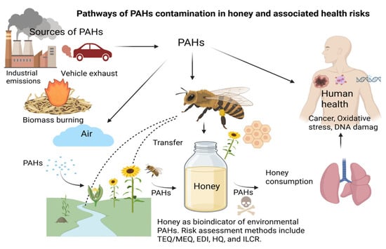 Honey is a widely consumed natural product with recognized nutritional and therapeutic properties. It has recently gained attention as a potential bioindicator of environmental contamination due to its ability to accumulate pollutants such as heavy metals, pesticides, and polycyclic aromatic hydrocarbons (PAHs) [1,2]. Among these, PAHs have attracted special attention due to their toxicity, persistence and carcinogenicity [3]. PAHs are a class of toxic, oil-soluble organic pollutants, primarily produced by incomplete combustion of fossil fuels, biomass, and waste. These pollutants are ubiquitous in the air and can enter honey through bees collecting contaminated pollen and nectar or through the deposition of airborne particles [4]. Several PAHs—such as benzo[a]pyrene (BaP), fluoranthene (FL), and pyrene (Pyr)—have been classified by the USEPA as priority pollutants due to their toxicity and mutagenic effects [5]. Long-term exposure to PAHs may cause adverse health effects such as endocrine disruption and increased cancer risk [6]. Furthermore, emerging evidence indicates that not only parent PAHs but also their transformation products—such as oxygenated (OPAHs) and nitrated PAHs (NPAHs)—can be detected in honey. These derivatives are generated by atmospheric photochemical reactions or by microbial transformation of parent PAHs. Some may possess mutagenic and carcinogenic potency equal to or even higher than the original compounds [7,8]. Recognizing the presence of parent PAHs and modified PAHs emphasizes the need for comprehensive monitoring of honey as a food and environmental monitoring indicator. Consequently, monitoring PAH contamination in honey not only serves as an environmental assessment tool but also addresses growing concerns about food safety and public health. Figure 1 provides an overview of the environmental pathways leading to PAH contamination in honey and their associated health risks.