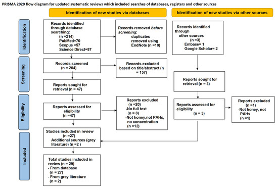 The search strategy applied in the current study is shown in Figure 2, according to the PRISMA flow chart. A total of 214 articles were retrieved from international databases, including Scopus (n = 57), PubMed (n = 70), and ScienceDirect (n = 87), covering the period from 1 January 2000 to 31 May 2025. At the start of the study, 10 duplicate articles were excluded. Only 204 articles were considered relevant based on their titles, and 157 articles were excluded because their abstracts were irrelevant. The remaining 47 articles were evaluated based on their full-text content; 12 articles were excluded because they did not contain honey, PAHs, or specific concentrations; and 8 articles were excluded because the full text was not available. In addition, 2 articles were retrieved from the gray literature search, resulting in a total of 29 full-text articles included in the review.