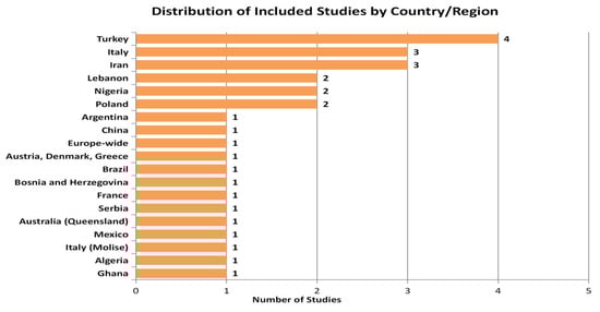 The reviewed literature demonstrates broad geographical coverage. As indicated in Figure 3, Turkey was the most frequently studied country (n = 4), followed by Italy and Iran (n = 3 each), with additional contributions from Lebanon, Poland, Nigeria, and other regions.