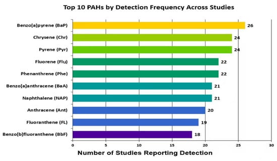 The 29 studies included in this review analyzed a diverse range of PAHs, with notable differences in both the number and specific compounds assessed across studies. A total of 17 studies (58.6%) specifically targeted all 16 priority PAHs designated by the USEPA, which are widely regarded as the standard reference for evaluating environmental pollutants and food contaminants [26,29]. These studies typically employed standardized analytical techniques such as GC–MS or GC–MS/MS, HPLC, and QuEChERS based extraction protocols to ensure accurate detection and quantification [2,18].