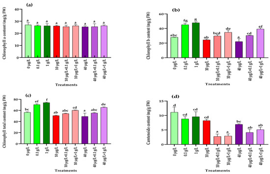 Photosynthetic pigment contents (mg/g FW) in radish leaves after 45 days of treatment with 0 µg/L (water and nutrient solution), L. platensis extract (0.1 and 1 g/L), MCs (10 and 40 µg/L), and their combinations. (a) Chlorophyll a, (b) chlorophyll b, (c) total chlorophyll, and (d) carotenoids. Bars represent mean values ± standard deviation (SD). Different letters indicate significant differences (p < 0.05, Tukey’s HSD test).