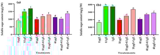 Total sugar content (mg/g FW) in leaves (a) and roots (b) of the radish leaves after 45 days of treatment with 0 µg/L (water and nutrient solution), L. platensis extract (0.1 and 1 g/L), MCs (10 and 40 µg/L), and their combinations. Bars represent mean values ± SD. Different letters indicate significant differences (p < 0.05, Tukey’s HSD test).