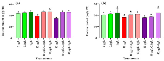 Total proteins content obtained from radish leaves and roots treated with the different extracts alone or in combination are presented in Figure 3. In the leaves, exposure to MCs at both concentrations (10 and 40 µg/L) caused a dose-dependent decline in total protein content compared with the control (Figure 3a). However, co-application of L. platensis extract with MCs led to a significant recovery (p < 0.001) of protein levels, restoring them close to the control values (Figure 3a). In contrast, no significant (p = 0.122) variations were observed in root protein content across the different treatments compared with the control (Figure 3b).