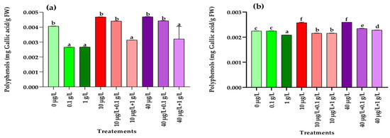 Polyphenol contents (mg Gallic acid/g FW) in leaves (a) and roots (b) of the radish leaves after 45 days of treatment with 0 µg/L (water and nutrient solution), L. platensis extract (0.1 and 1 g/L), MCs (10 and 40 µg/L), and their combinations. Bars represent mean values ± SD. Different letters indicate significant differences (p < 0.05, Tukey’s HSD test).