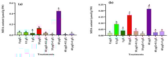 Malondialdehyde content (MDA) (µmol/g FW) in leaves (a) and roots (b) of the radish leaves after 45 days of treatment with 0 µg/L (water and nutrient solution), L. platensis extract (0.1 and 1 g/L), MCs (10 and 40 µg/L), and their combinations. Bars represent mean values ± SD. Different letters indicate significant differences (p < 0.05, Tukey’s HSD test).