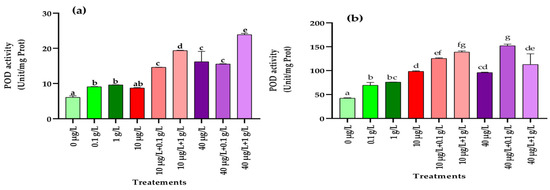 Peroxidase (POD) activity (Unit/mg Prot.) in leaves (a) and roots (b) of the radish leaves after 45 days of treatment with 0 µg/L (water and nutrient solution), L. platensis extract (0.1 and 1 g/L), MCs (10 and 40 µg/L), and their combinations. Bars represent mean values ± SD. Different letters indicate significant differences (p < 0.05, Tukey’s HSD test).