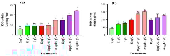 Superoxidase dismutase (SOD) (Unit/mg Prot.) in leaves (a) and roots (b) of the radish leaves after 45 days of treatment with 0 µg/L (water and nutrient solution), L. platensis extract (0.1 and 1 g/L), MCs (10 and 40 µg/L), and their combinations. Bars represent mean values ± SD. Different letters indicate significant differences (p < 0.05, Tukey’s HSD test).