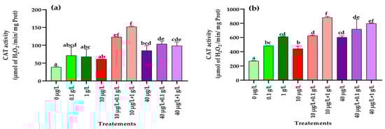 Catalase (CAT) (µmol of H2O2/min/mg Prot.) in leaves (a) and roots (b) of the radish leaves after 45 days of treatment with 0 µg/L (water and nutrient solution), L. platensis extract (0.1 and 1 g/L), MCs (10 and 40 µg/L), and their combinations. Bars represent mean values ± SD. Different letters indicate significant differences (p < 0.05, Tukey’s HSD test).