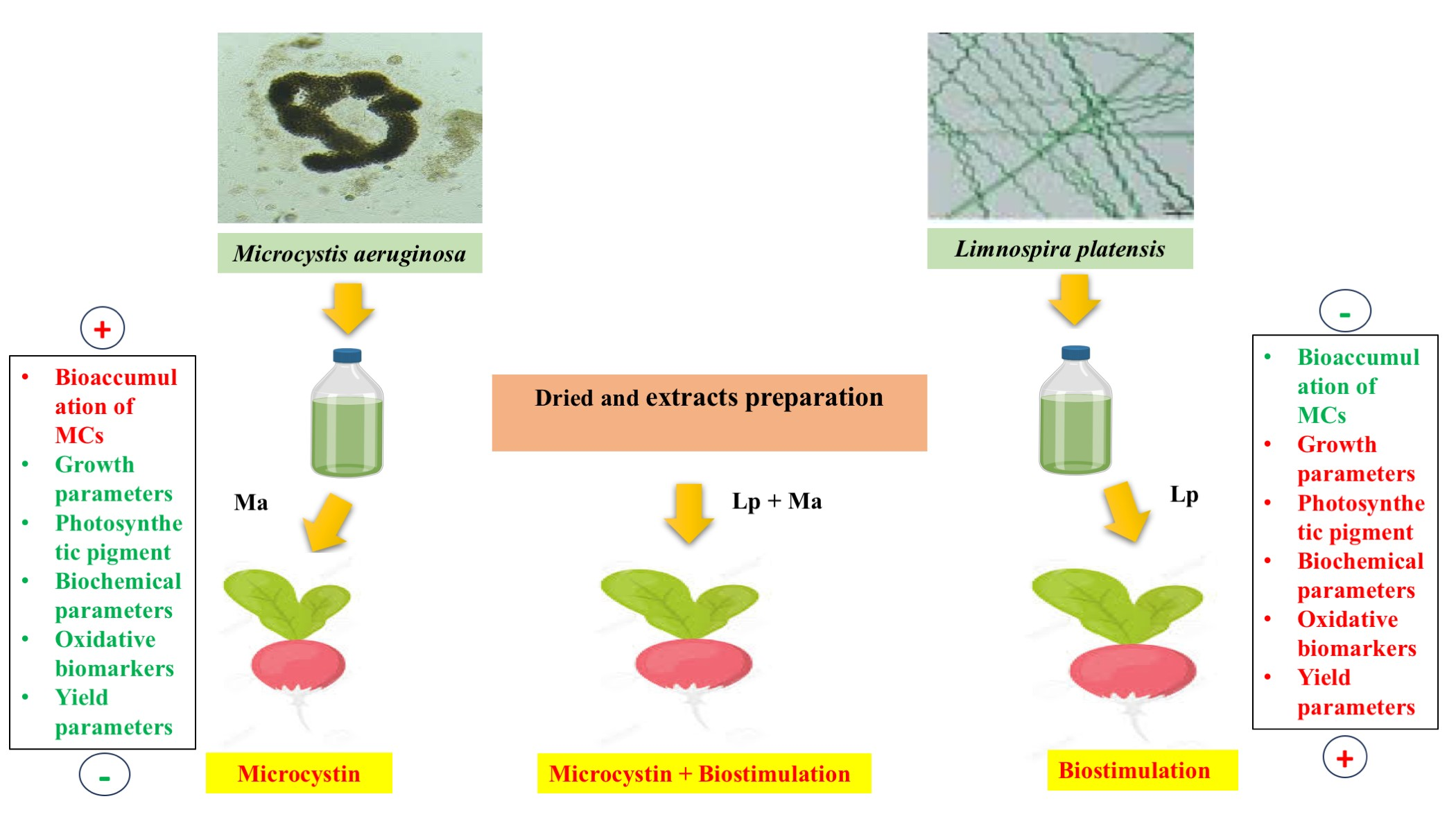 - C2 + B2: irrigation with water containing 40 µg/L of MCs + 1 g/L L. platensis extract.