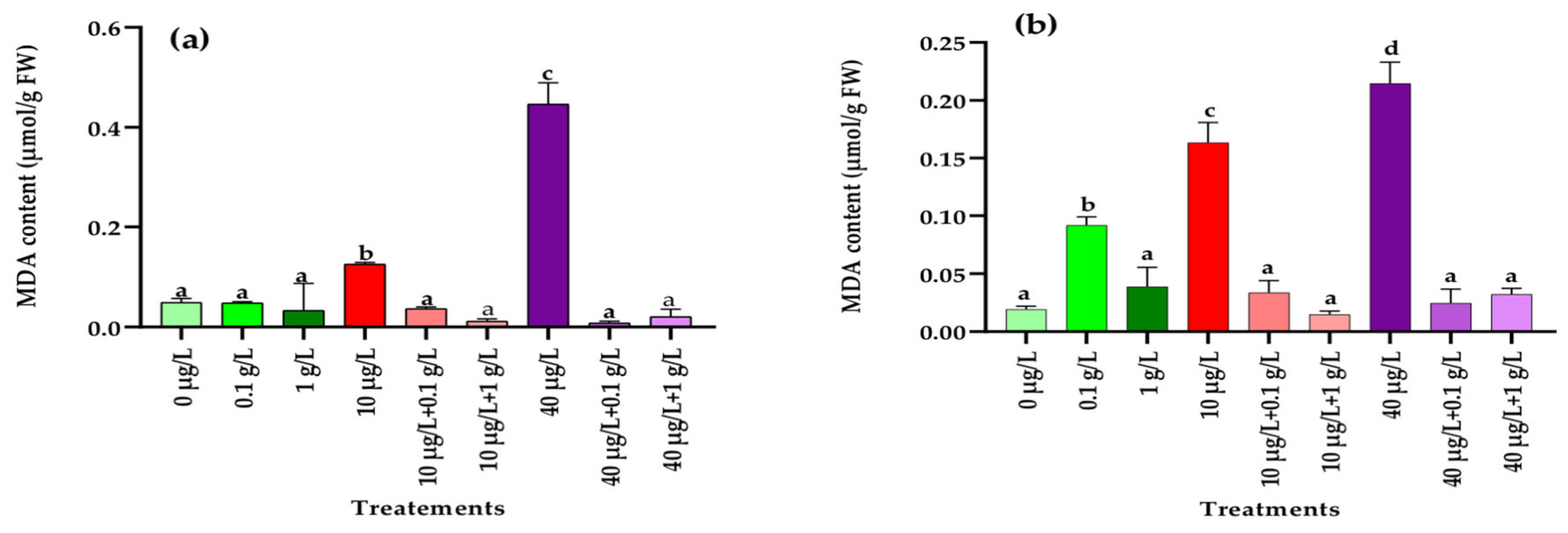 3.5. Effect of L. platensis Extract on Stress Markers of Radish-Stressed by MCs