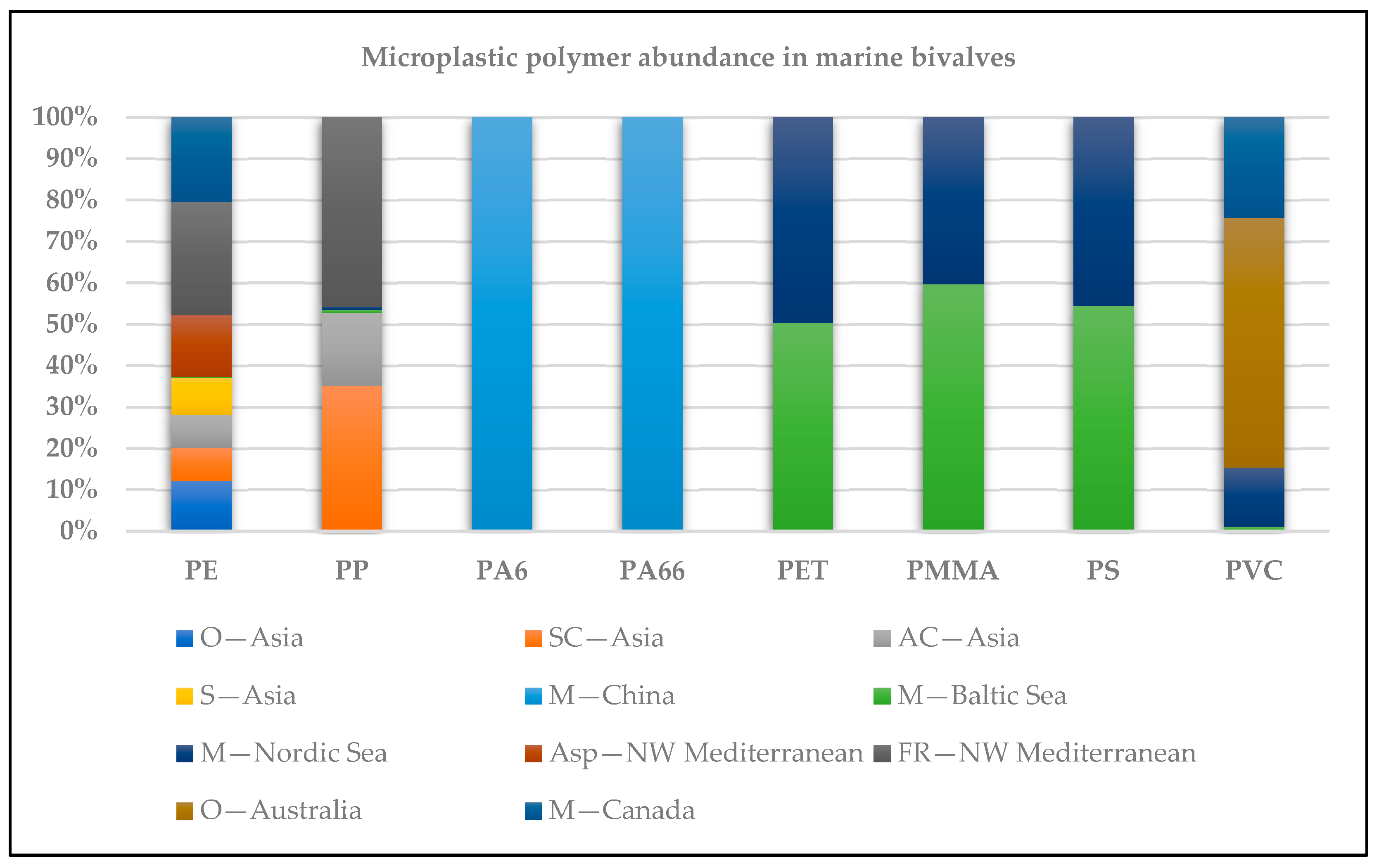| Bivalves from 14 countries across the world | 0–8369 (MPs/year) | PVC, PET, PE, PS, PMMA, PA, PP | 220– 12,050 | ![]() | [68] |