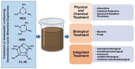 Cyclic nitramine explosives such as octahydro-1,3,5,7-tetranitro-1,3,5,7-tetrazocine (HMX), hexahydro-1,3,5-trinitro-1,3,5-triazine (RDX), and 2,4,6,8,10,12-hexanitro-2,4,6,8,10,12-hexaazaisowurtzitane (CL-20) are xenobiotics that are utilized in a variety of propellants and traditional weapons. The primary source of water contamination is the industrial use of these hazardous substances in propellants and wastewater generated from munitions production facilities. These chemicals have a negative impact on human health and ecosystems. It is necessary to remove these toxic compounds from the environment safely because their production and usage have seriously contaminated soil and groundwater. Although there are no widely adopted WHO or US federal Maximum Contaminant Levels (MCLs) for military explosives, the health advisory limits for RDX in drinking water are 2 µg/L, and for HMX are 400 µg/L. Numerous traditional treatment approaches that incorporate physical, biological, and chemical processes have been used to decontaminate explosive wastewater. However, contaminants are not completely mineralized by these methods. Complete reduction of these chemicals can be accomplished by combining suitable methods. For the remediation of explosive effluent, integrated treatment systems that combine the effectiveness of biological and physical-chemical methods have shown promising results. This review discusses the toxicity and some physical–chemical–biological and combined treatment processes of wastewater polluted by these explosive contaminants.