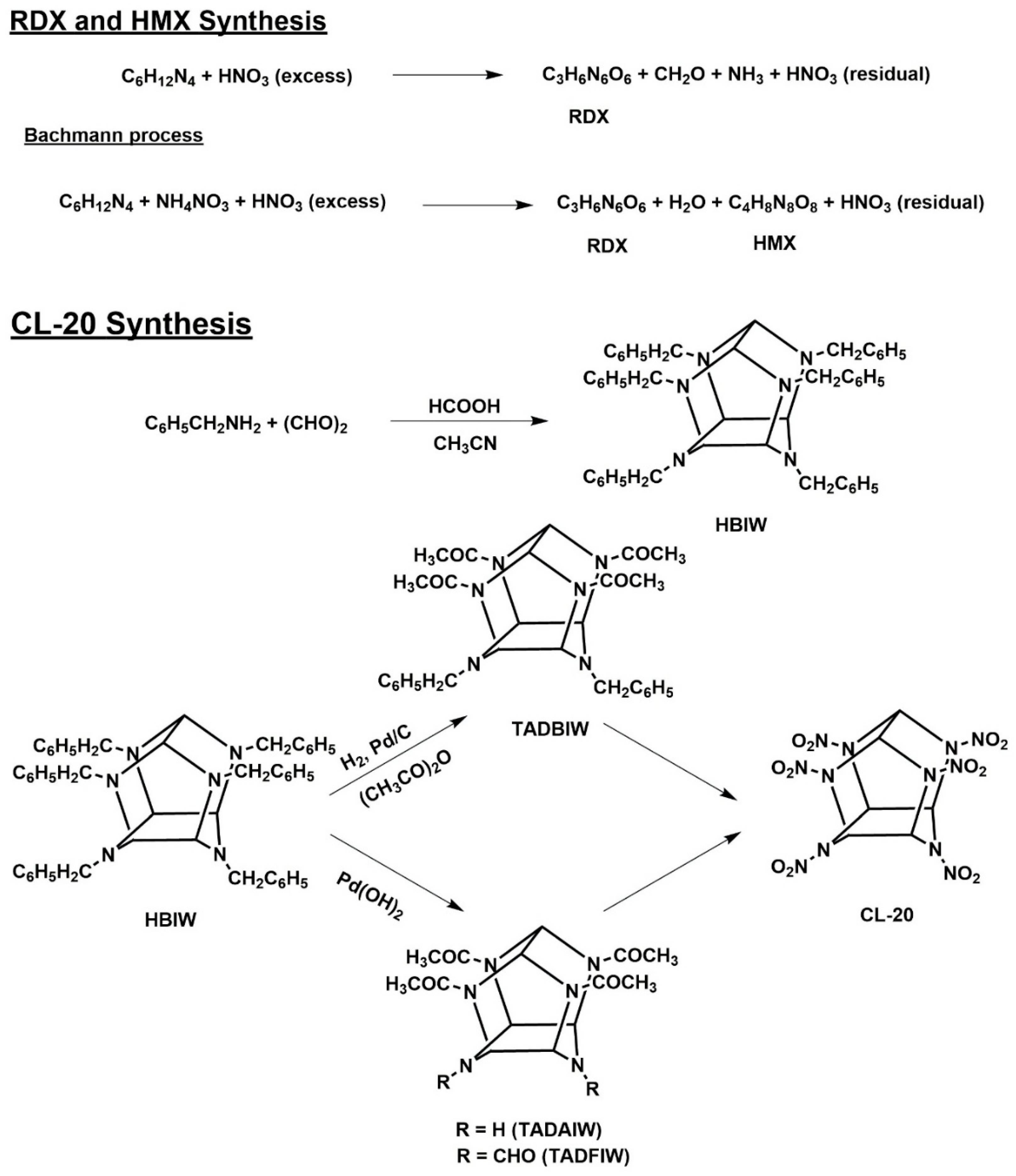 Figure 1. Synthesis of Nitramines RDX, HMX, and CL-20 [54,55,56,57].