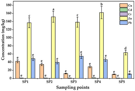 Concentrations of PTEs in soils from Luzira Industrial Area, Uganda. Error bars represent standard deviations of triplicate measurements. Different letters above the bars represent statistically significant differences among sampling points as per the Tukey test (p < 0.05).