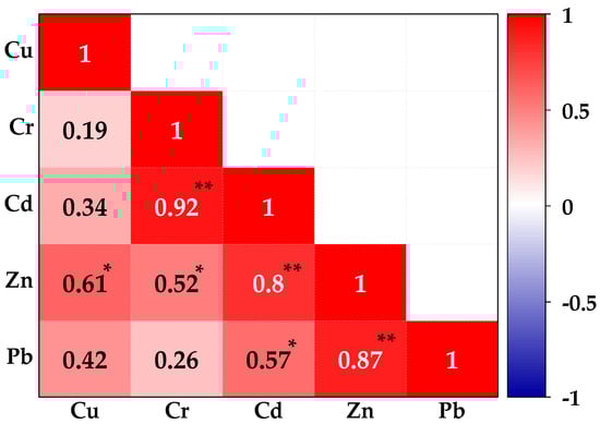 Pearson correlation matrix plot for the interrelationship between PTEs in the soils sampled from the Luzira Industrial Area, Uganda. * Significant at p < 0.05 (2-tailed), ** Also significant at p < 0.01 (2-tailed).
