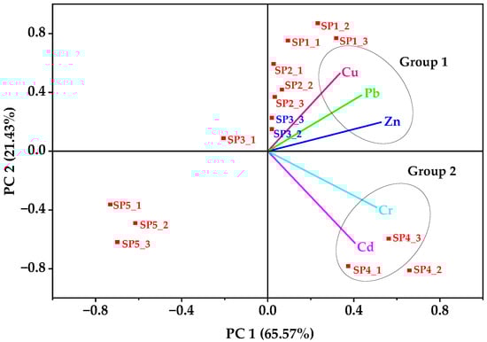 Biplot loading of the principal components of the five PTEs in soils from the Luzira Industrial Area, Uganda.