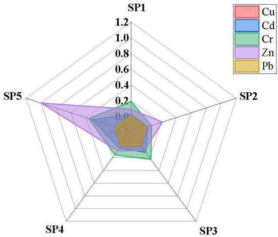 The pollution load index provides a cumulative assessment of overall soil contamination by multiple PTEs at a given sampling point. It is derived from the geometric mean of the individual contamination factors (Equation (2)) [].