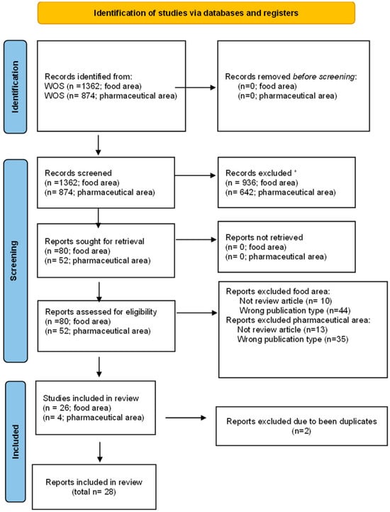 A total of 28 records have been finally included in this study. Of these, 24 correspond to publications exclusively in the food field, 2 to the drugs field, and the remaining 2 refer to both the food and pharmaceutical sectors [,].