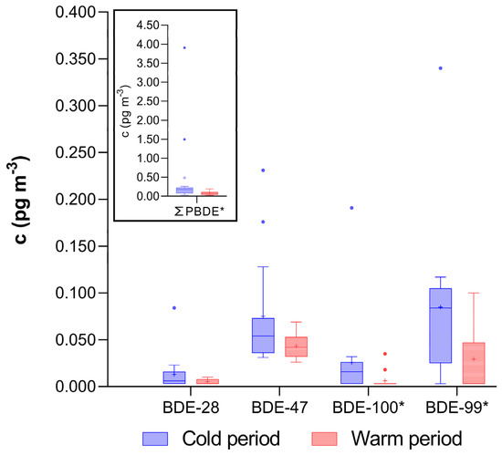 Concentration of individual PBDE congeners (excluding BDE-153, BDE-154, and BDE-183, as their concentrations were below the LOD in over 80% of the samples) and sum (ΣPBDE) in PM1 fraction of indoor air obtained in 15 homes from Zagreb, Croatia. The data are presented as median (line), mean (+), 25th and 75th percentile (box), and interquartile range (whisker), and outliers (•). * Significantly higher concentrations in colder period (Wilcoxon Matched Pairs Test; p < 0.05).