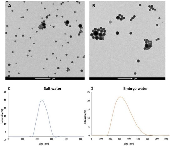 TEM micrographs of both plain and fluorescent PLA NPs are shown in Figure 1A,B. The NP size measured in a random sample of 250 NPs was 141.35 ± 38.37 nm (min: 82.66 nm; max: 309.33 nm; median: 133.57 nm) for plain PLA NPs and 259.34 ± 158.98 nm (min: 94.66 nm; max: 1127.97 nm; median: 213.33 nm) for fluorescent PLA NPs. Overall, NPs were well dispersed, although some aggregates could be observed, especially in the fluorescent PLA NPs, where larger particles were found. Results of the DLS analysis of plain PLA NPs showed that at a concentration of 100 mg/L, the hydrodynamic particle diameter was 266.94 ± 23.47 and 311.37 ± 27.58 nm in 30 ppt salt water (artificial marine water) and in zebrafish embryo water, respectively (Figure 1C,D). In both cases, particles showed low Z-potential values: 0.88 ± 1.86 mV and 2.35 ± 0.95 mV in salt water and zebrafish embryo water, respectively.
