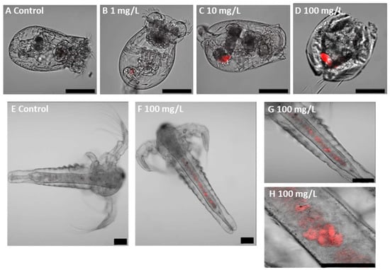 Fluorescent PLA NP uptake and localisation in rotifers (A–D) and brine shrimps (E–H) after 48 h of exposure. Scale bars (A–G): 100 µm. Scale bar (H): 50 µm.